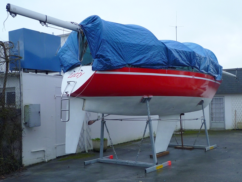 Mai 2012 : Letty a passé l'hiver à flot sans naviguer au ponton à Bénodet. En le sortant de l'eau, il y avait sur la carène une sorte de mousse avec, par endroits, quelques algues fines accrochées. Un simple coup de karcher a suffit pour le nettoyer.