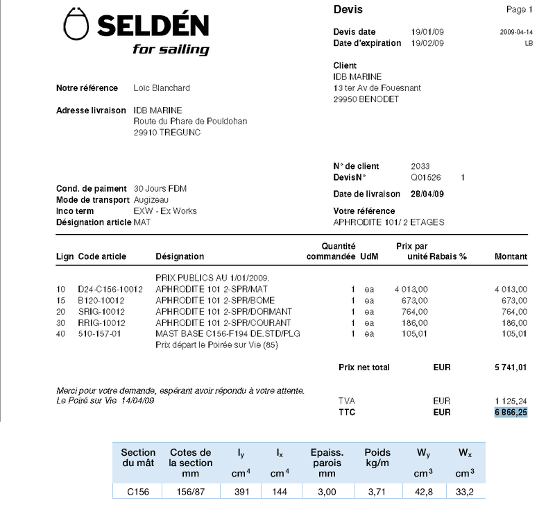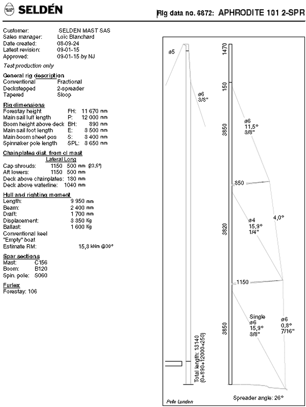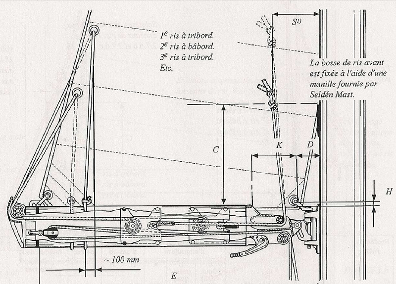 Vous trouverez ci dessous les cotes et tarifs que j'ai obtenu de SELDEN pour les propriétaires d'Aphrodites 101 pour la version que j'ai retenu (à deux étages sans bastaque), ainsi que le plan de renvoi des drisses.