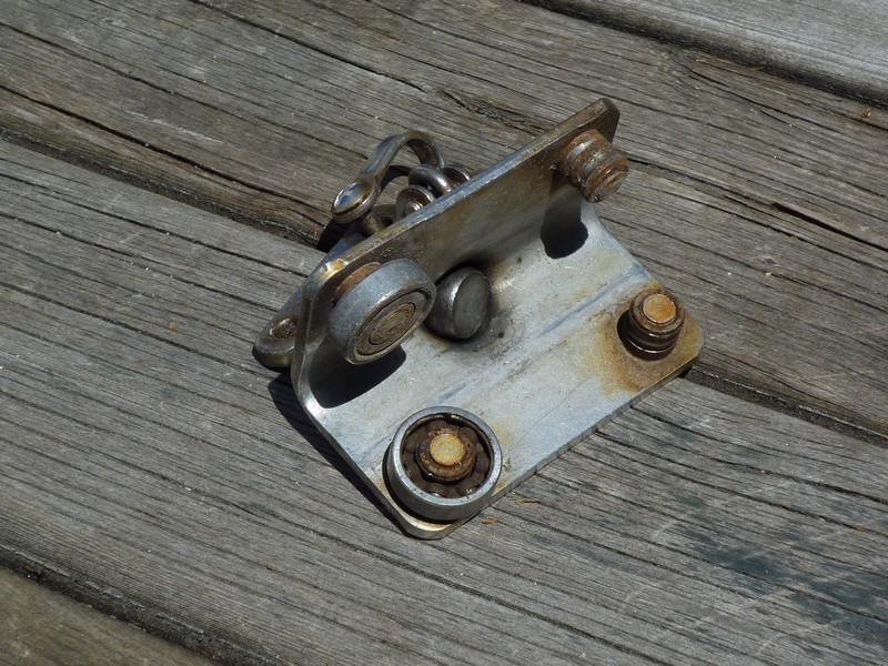 Mon 101 est agé .... Le rail de foc est usé et le chariot a rendu l'âme rapidement par 25 noeuds de vent (voir photo). J'ai tenté de le remplacer par l'ancien chariot de GV mais ce dernier, équipé de simples galets, se bloquait sur le rail sous tension !