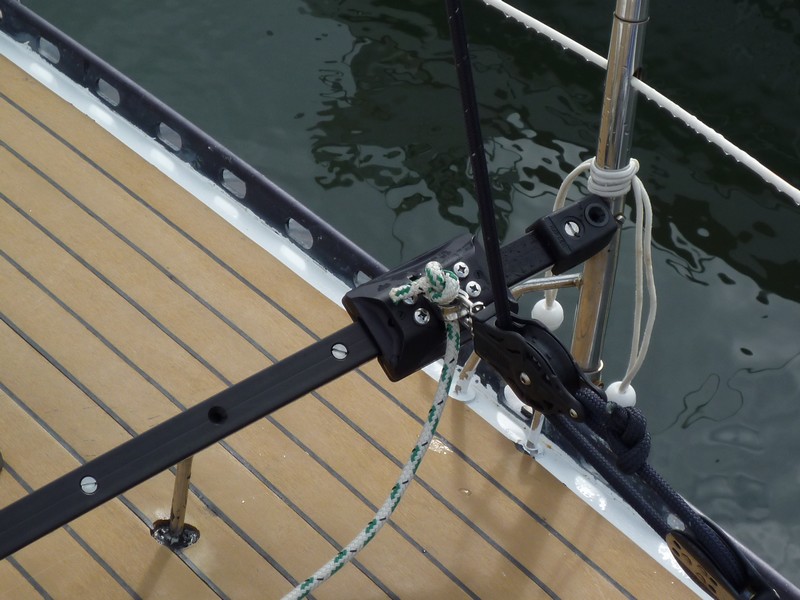 A l'usage je me suis rendu compte ensuite que c'était plutot raide à étarquer.... alors j'ai fixé une cadène sur la tableau et mis une poulie sur le pataras que j'ai ensuite remplacée par un oeil...