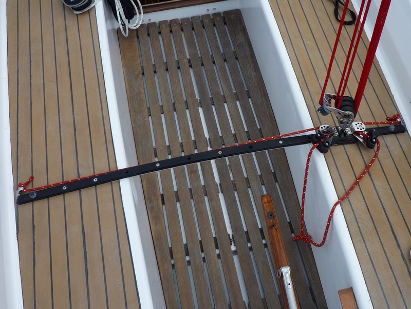 La barre d'écoute d'origine relie les deux banquettes... et offre donc une course ridicule. Certes elle est amovible mais bon.. De plus le chariot était mort... et le rail... usé !
