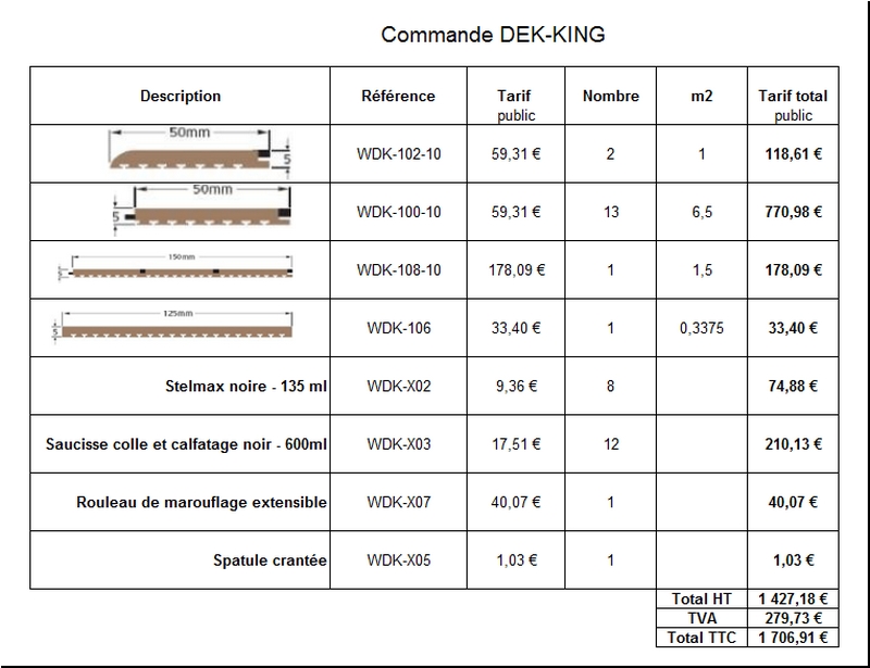 En fait il existe plusieurs concepts dans ce domaine (Teck-it-easy, Casa Mare, Seacork, Dek-King et même Treadmaster) et je me suis finalement décidé pour du Dek-king. Ce produit, diffusé en France par le chantier des Vénètes est en fait constitué de lattes en pvc extrudé qui s'assemblent comme des lattes de teck.