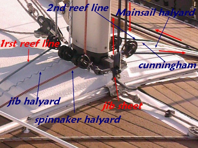 J'ai profité du changement de gréement pour adopter la solution retenue sur les Malango : l'écoute remonte dans le mât (au niveau du 2ième étage de barres de flèches) puis est renvoyée via le pied de mât et les renvois de drisse sur un des winchs de drisses (celui de babord en l'occurence).