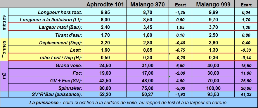 Pour compléter, un tableau comparatif - j'ai ajouté le Malango 870 qui dispose d'une longueur à la flottaison plus proche de l'Aphrodite 101.